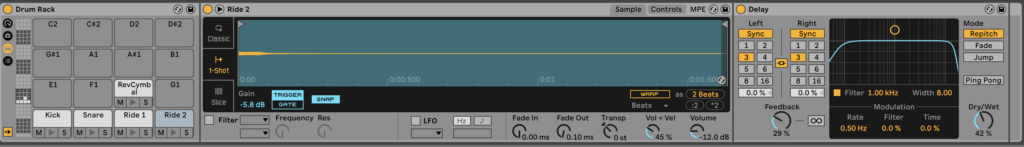 Vamos a programar un platillo que suena en medio de la secuencia, dibujamos dos notas en la división de compás 2.3 y a este sonido puntualmente le añadiremos un Delay. Lo podemos seleccionar de Audio Effects en el menú de Ableton Live y lo arrastramos encima del mismo slot que lo contiene (dentro del Drum Rack), así sólo estará afectando a este Ride. El Delay lo configuramos con retardo de 3 en ambos canales y un feedback medio.