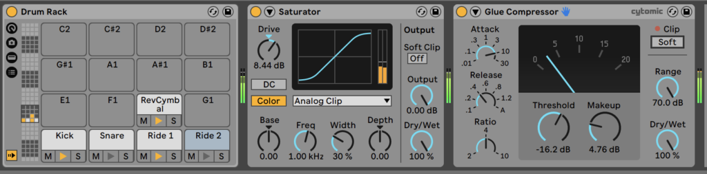 Acto seguido, vamos a darle un poco de distorsión y fuerza a toda la batería, buscamos un efecto que se llama “Saturator” y lo cargamos en la pista. En este ejemplo hemos ajustado la entrada de señal con la perilla “Drive” y lo demás lo hemos dejado tal cual, sin embargo podemos probar diferentes configuraciones, como una distorsión más agresiva por ejemplo.