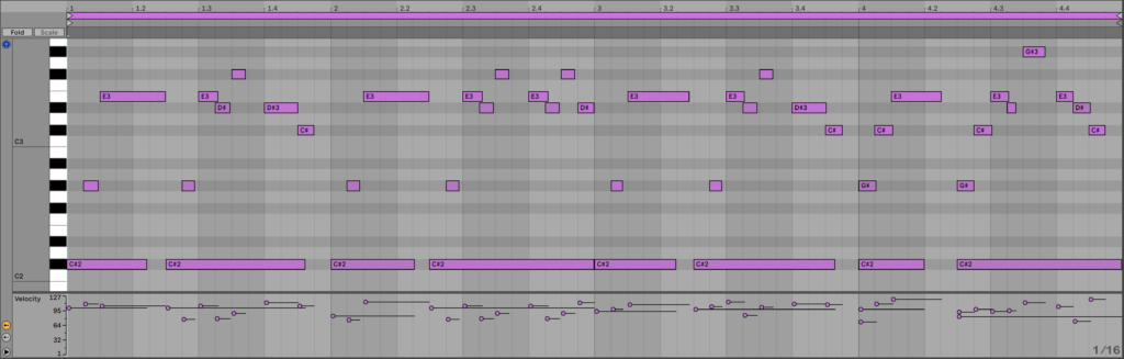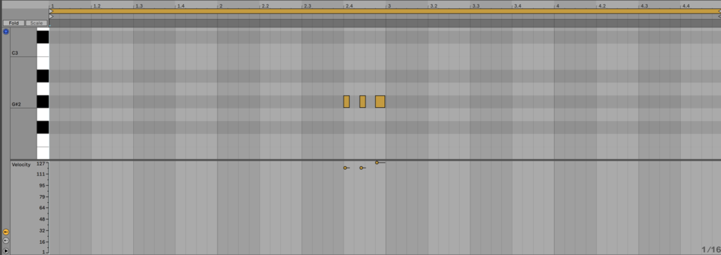 En una pista nueva, insertamos este instrumento y programamos 3 notas en G#2 con una sutil variación de la tercera nota tanto en duración como en velocidad. La nota intermedia tiene un swing hecho manualmente que hace que se mueva un poco a la derecha de la rejilla. No olvidemos añadir algo de Delay, en este caso usamos el envío al Delay que viene por defecto.