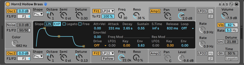 En Ableton Live, vamos a la carpeta “Sounds” en el browser y buscamos el preset “Horn2 Hollow Brass”. En caso de no tenerlo, dentro de los sonidos que compartimos tienes el preset para cargarlo o el sample en WAV (Brass Hit).