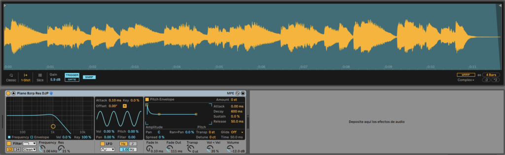 Una vez creada la línea de piano, hemos hecho un Bounce a WAV para tenerla en audio y poder manipular el Pitch bend y añadir algo de filtrado como en el tema original. En este caso usaremos el instrumento Simple en otra pista. Cargamos el audio Piano_Bzrp_Res_DJP y programamos en un clip de 4 BAR la nota C3 que lo haga sonar.