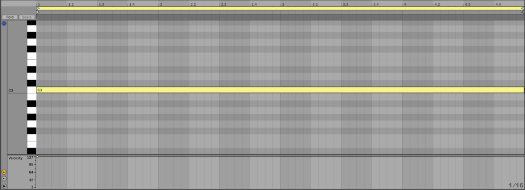 Usaremos Drum Rack para insertar los samples que compartimos en este Beats Remake. Creamos un clip MIDI de 4 BAR y la rejilla la configuramos a 1/16. Programamos el bombo como en la imagen, 3 notas por cada compás. En el último compás emulamos el sampleo que hace Bizarrap de la secuencia de la batería.