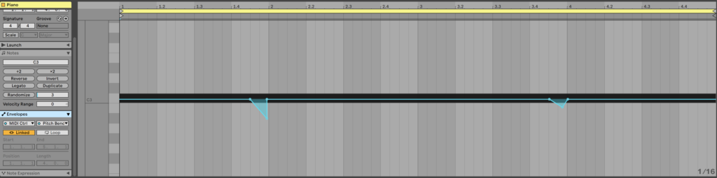 Por último, jugaremos con la modulación del Pitch Bend. Vamos a la caja de Envelopes a la izquierda del Piano Roll, seleccionamos MIDI Ctrl y Pitch Bend y hacemos una variación leve como en la imagen. Esto le da ese toque de desafinación que escuchamos constantemente en el tema de Bizarrap.
