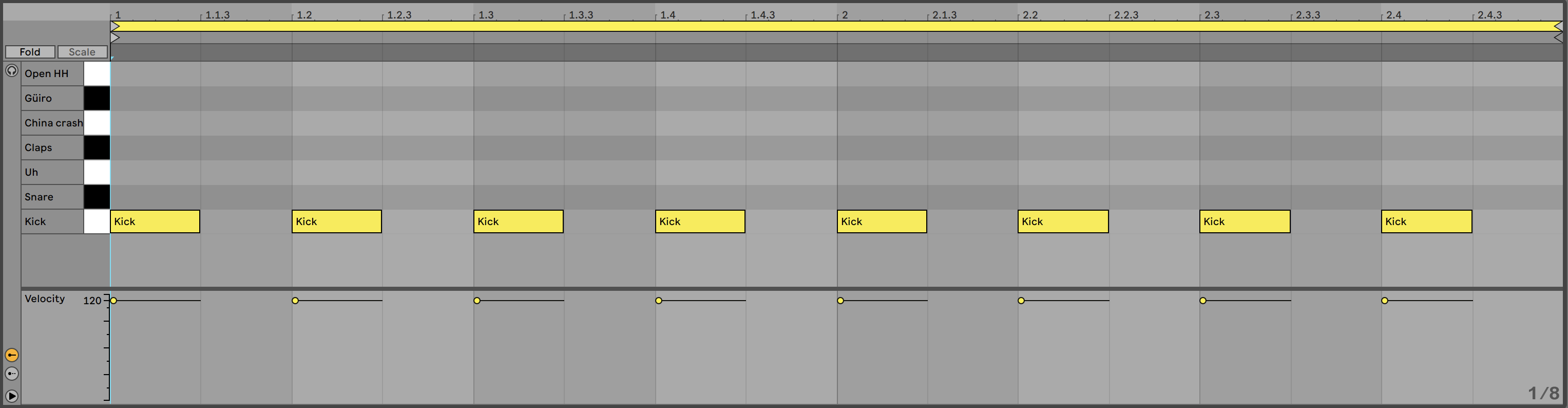 Trabajaremos con un instrumento Drum Rack vacío, cargamos el sample Kick en una celda y creamos un clip de 2 BAR. A continuación elegimos la división de 1/8 en la rejilla y programamos un típico 4/4.