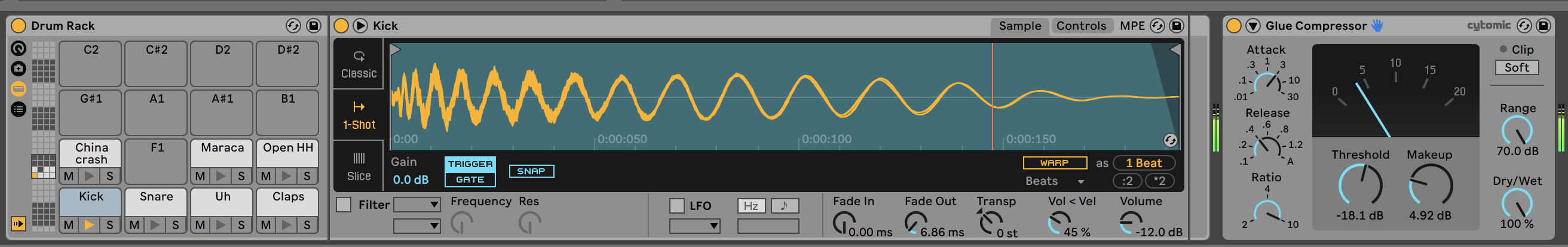 Adicionalmente, podemos añadir un Glue compressor inserto dentro de la pista del Drum rack y ajustar una compresión algo agresiva para equilibrar los elementos.
