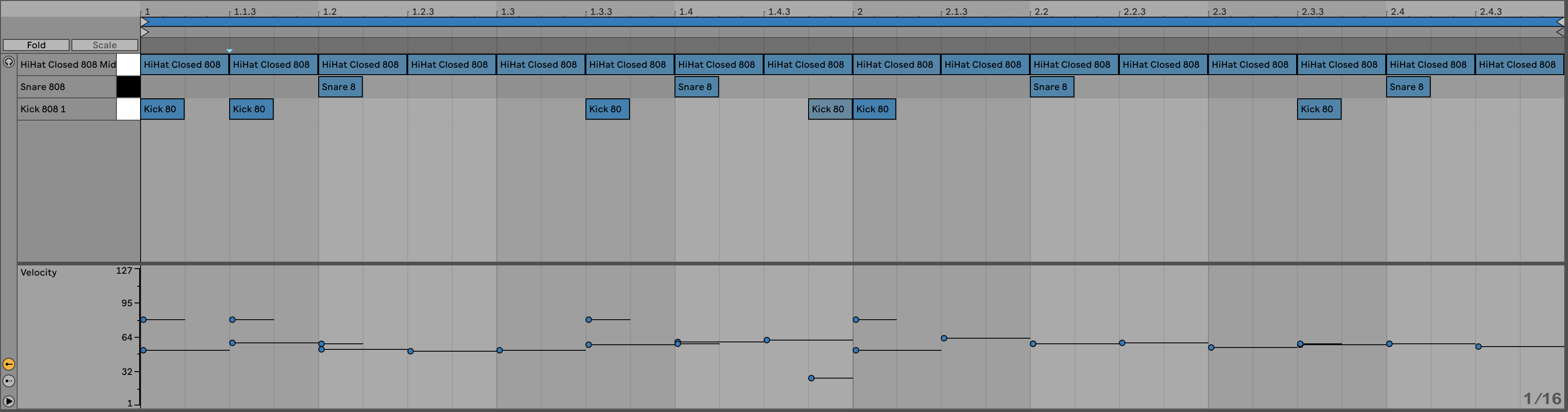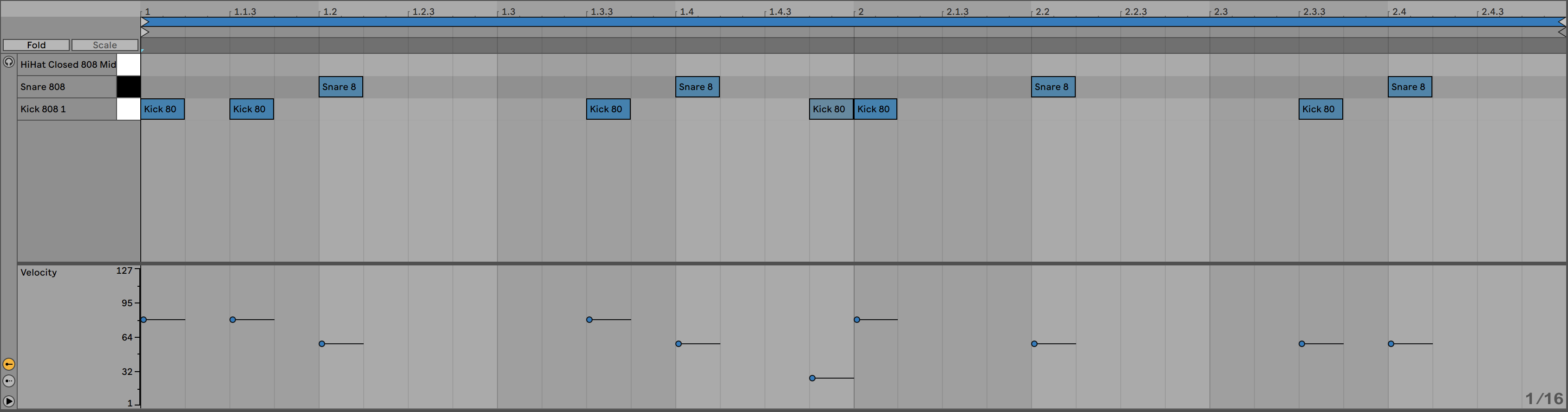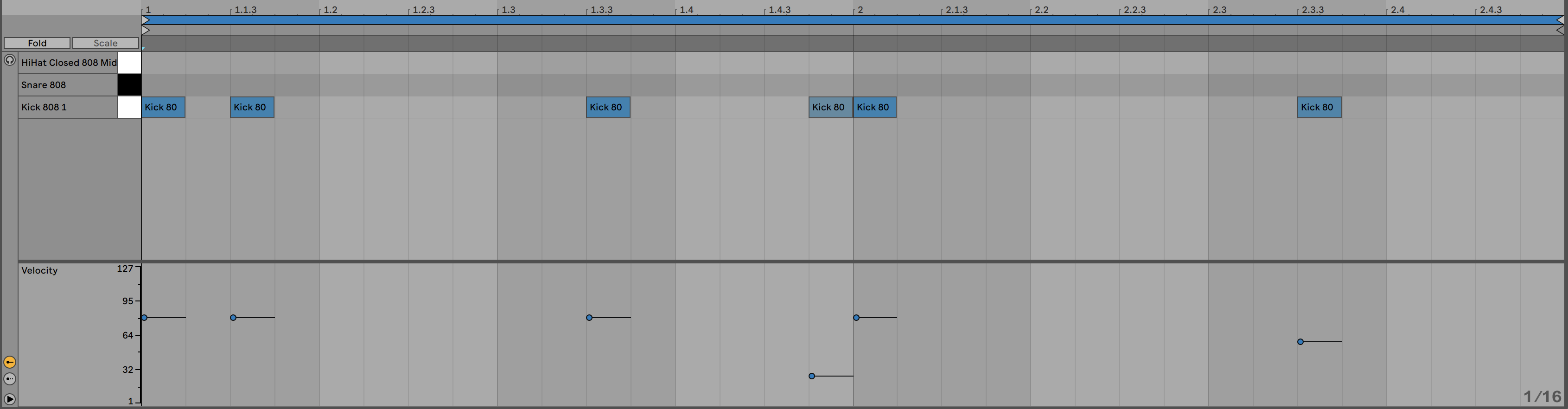 Como es habitual, cargaremos en un Drum Rack el sample de Kick 808, creamos un clip de 4 BAR y programamos las notas en la rejilla con división de 1/16. Haremos una pequeña variación de velocidad en la cuarta y la sexta nota como en la imagen.