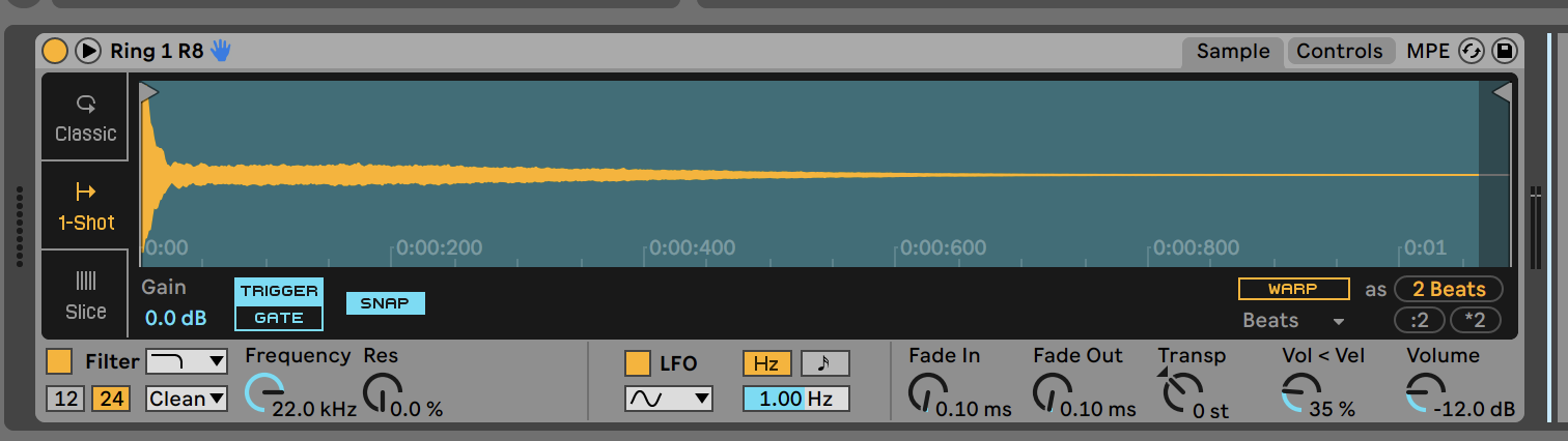 Utilizando el sample de sonido original extraído del banco de sonidos de la caja de ritmos Roland R8 (Ring 1) vamos a programar la melodía estilo Bell que acompaña al Beat. Podemos hacerlo en una pista aparte cargando el sonido en un Simpler.