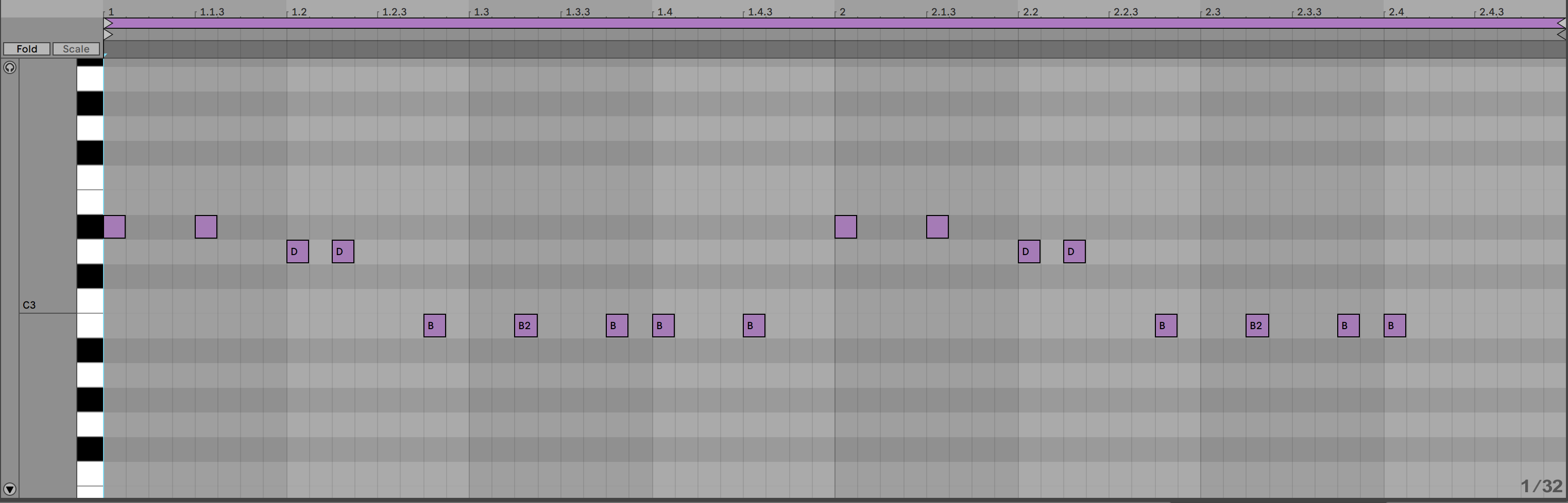 En un clip de 4 BAR grabamos o programamos las notas un semitono abajo (B2) como en la imagen.