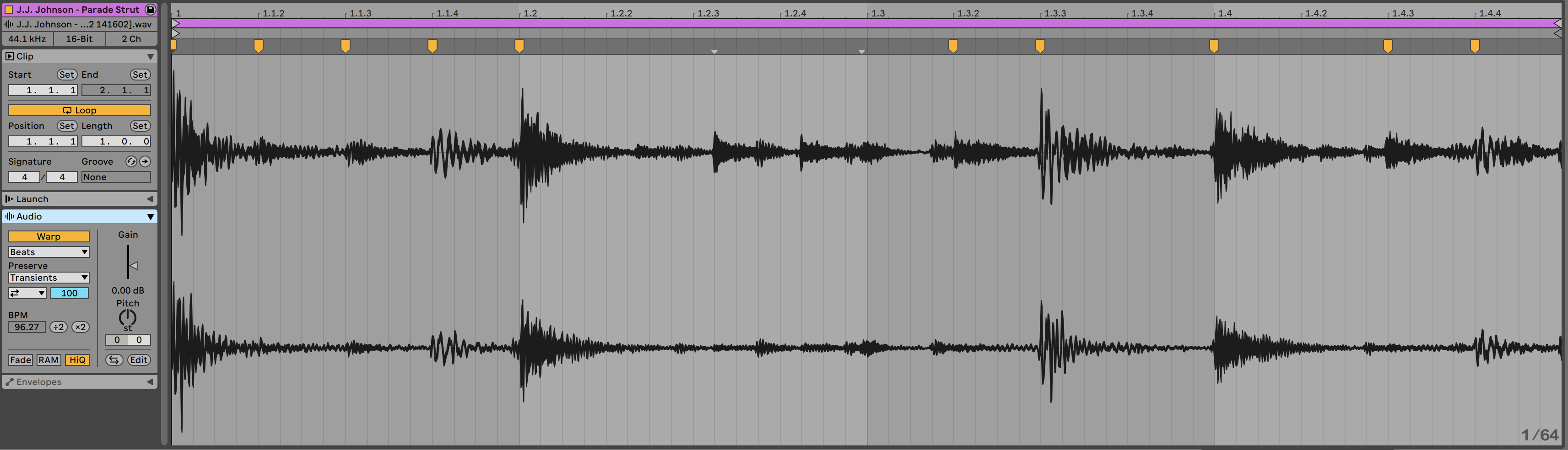 Para una mejor sincronía, podemos «cuantizar» a 1/16 o ajustar algunos tiempos con marcadores warp como los de la imagen, manteniendo el modo warp “Beats” que viene por defecto: