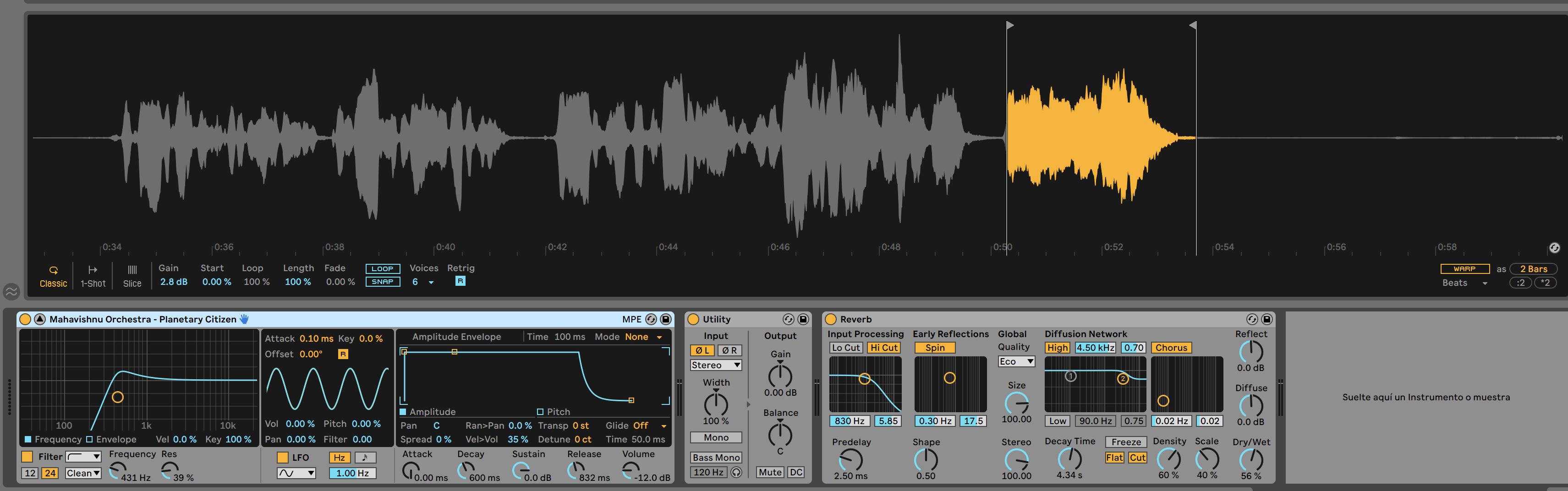 El sample de voz viene de la canción Planetary Citizen de Mahavishnu Orchestra, un tema de 1976. Aprovechando la inteligencia artificial, hemos subido la canción a la web vocalremover.org/es/ y logramos aislar la voz de la parte instrumental. Un extracto de esta vocal se encuentra en el pack de sonidos descargables (lo encontrarás al final del artículo).