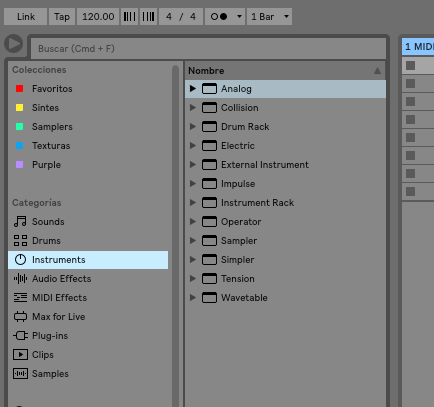 Pues bien, eso mismo es lo que encontrarás al abrir Ableton Live. Ubica el Browser que está a la izquierda, en la sección Instruments tendrás una increíble suite con diferentes alternativas propias del programa (sintetizadores y samplers), cada uno con un nombre o “marca” diferente. Estos son los sintetizadores que encontrarás: