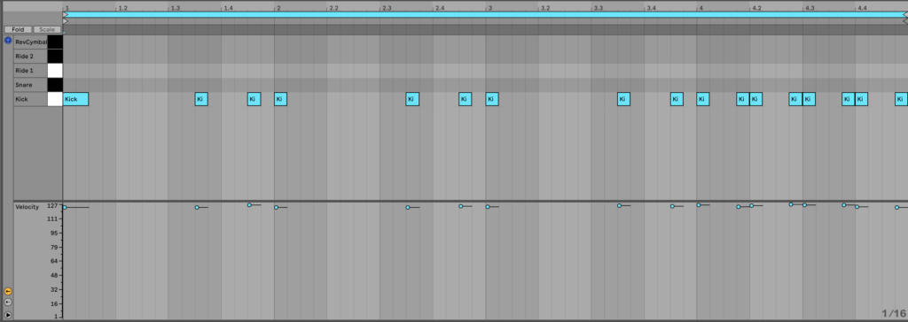 Usaremos Drum Rack para insertar los samples que compartimos en este Beats Remake. Creamos un clip MIDI de 4 BAR y la rejilla la configuramos a 1/16. Programamos el bombo como en la imagen, 3 notas por cada compás. En el último compás emulamos el sampleo que hace Bizarrap de la secuencia de la batería.
