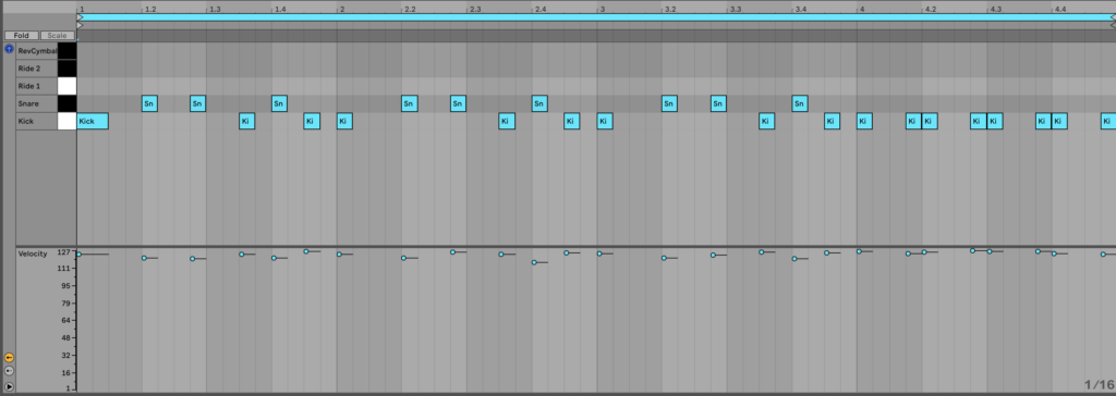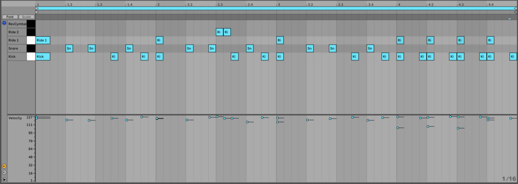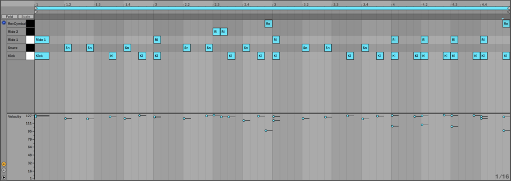 Para finalizar esta secuencia rítmica, programamos el sonido RevCymbal dibujando dos notas al final del compás 2 y 4.