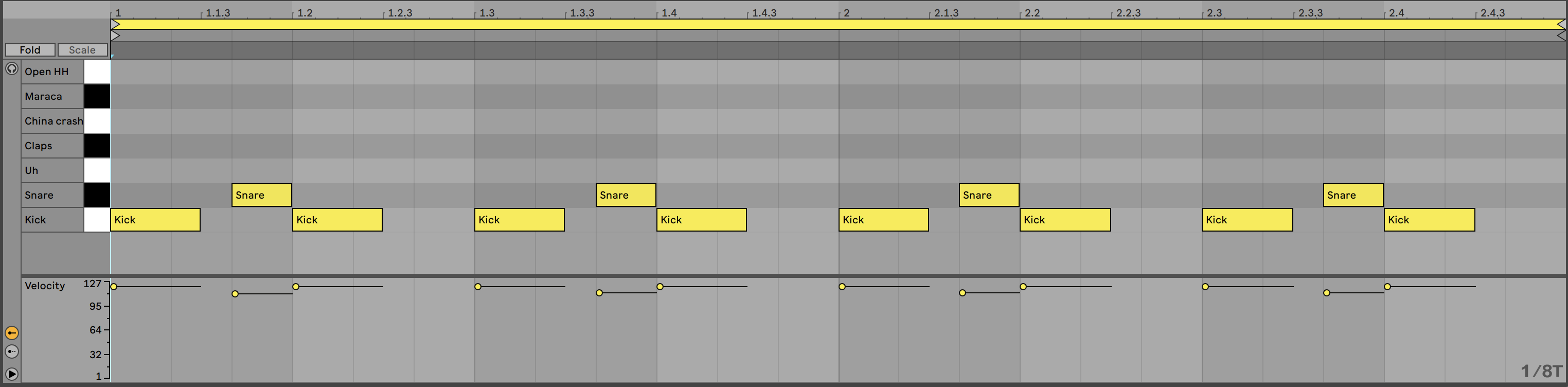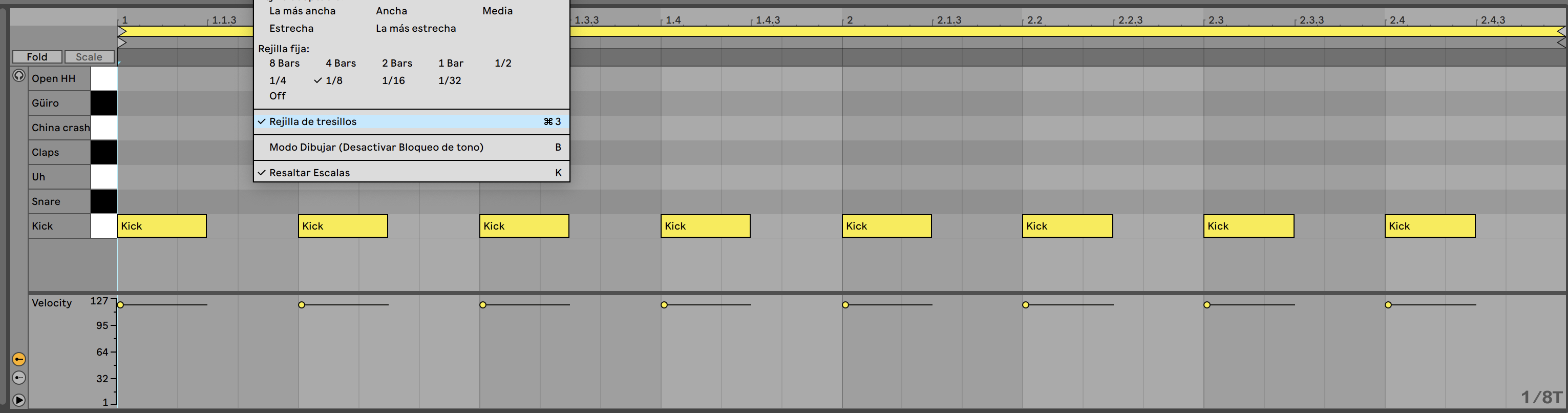 Trabajaremos con un instrumento Drum Rack vacío, cargamos el sample Kick en una celda y creamos un clip de 2 BAR. A continuación elegimos la división de 1/8 en la rejilla y programamos un típico 4/4.