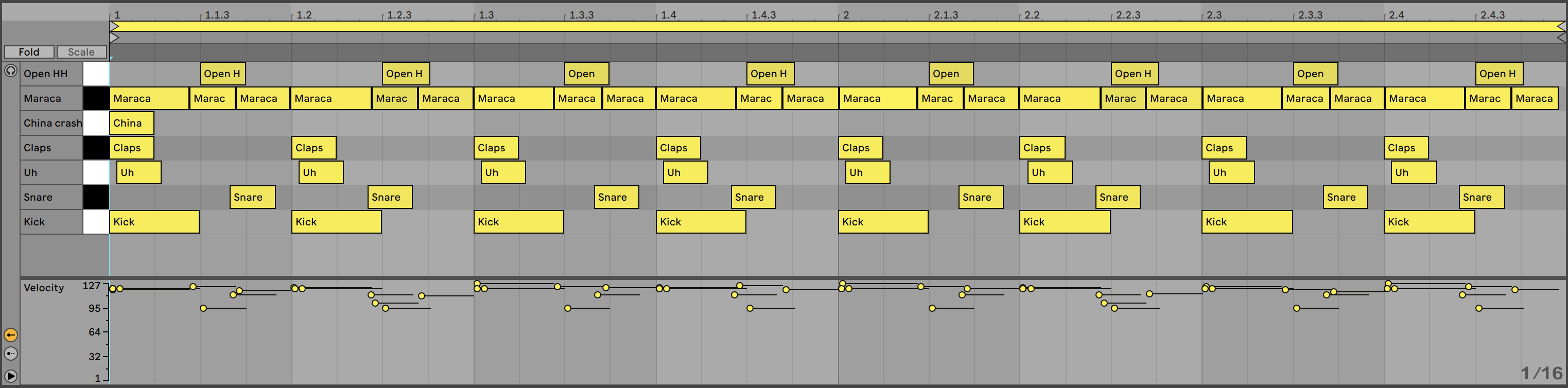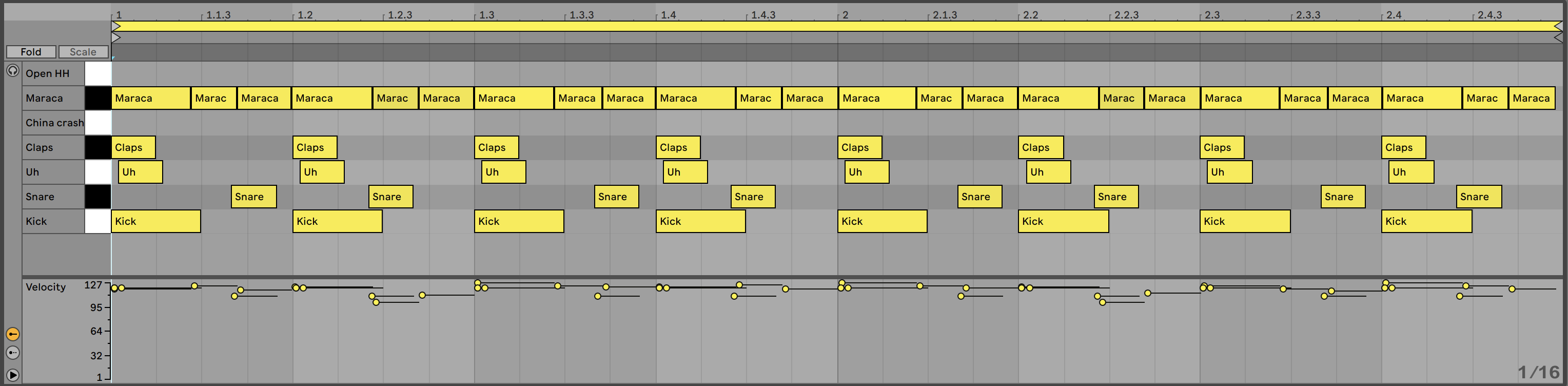 Por último, acompañaremos el beat con un hi hat abierto que programaremos a contratiempo del kick, bajándole la ganancia o el volumen en la mezcla y así mismo atenuaremos el valor de velocity para que no altere el groove de la maraca. Encontraremos también un sample de nombre China Crash que podremos usar para cuando empiece un nuevo ciclo de diferentes compases.