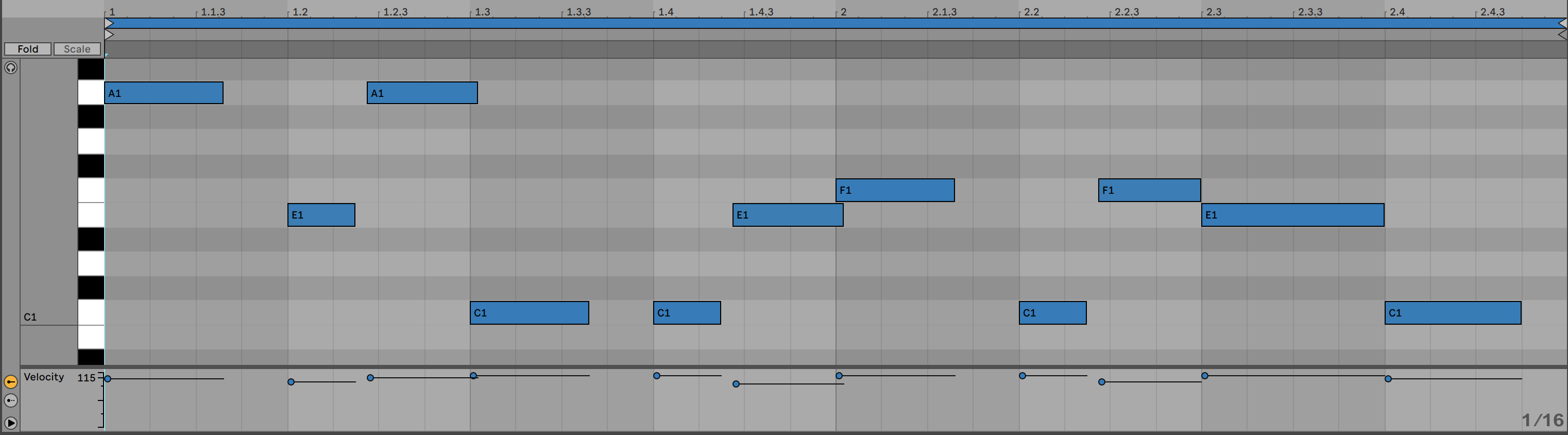 A continuación, podemos ajustar hacia abajo la velocidad de estas mismas notas para que den la sensación de movimiento débil y fuerte. Podemos probar también con el Randomize velocity del Live 11 y obtener diferentes resultados.