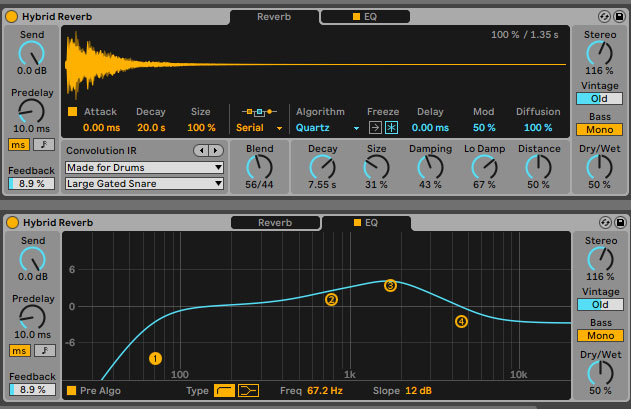 Un nuevo efecto que combina reverb por convulsión y reverberaciones algorítmicas. Puedes emular espacios sonoros arrastrando cualquier muestra de audio a esta reverb y experimentar con los diferentes efectos físicos que posee, ecualizar el resultado y añadir textura vintage.